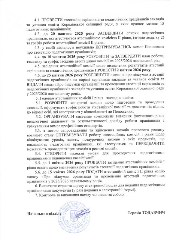 Після оформлення атестаційного листа про рішення комісії керівник закладу освіти має видати відповідний наказ, який є документом, що підтверджує присвоєння педагогічному працівникові кваліфікаційної категорії чи педагогічного звання.